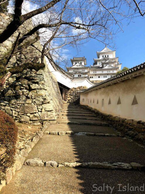 姫路城は敵から攻められにくくするために、お城までの道のりが長いことに加えて、坂と階段の多い、複雑な設計が特徴です。
