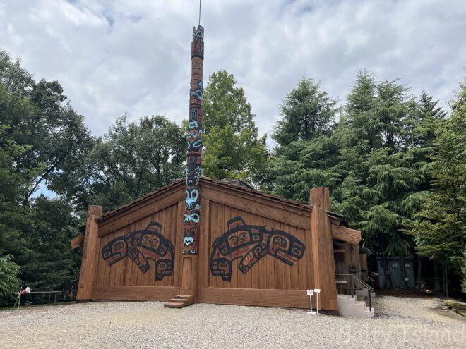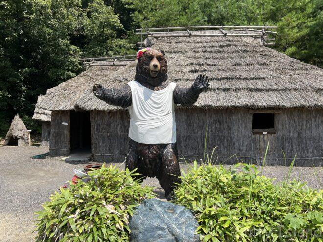 定番のフォトスポットは、アイヌの家とヒグマです。