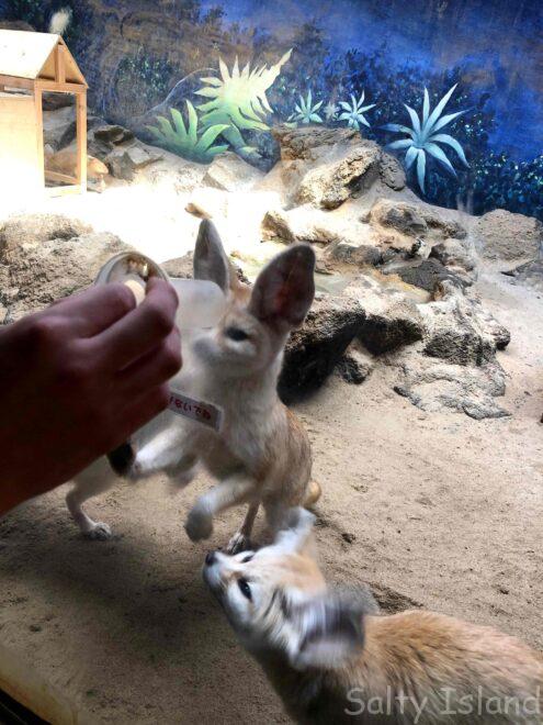 ガラス越しの動物でも、ガラスに一部穴が開いている部分があり、そこから餌を入れようとすると、動物たちが駆け寄ってきてくれます。