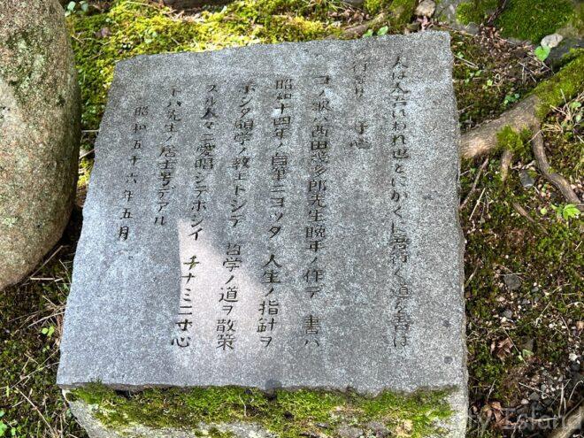 この石碑には、西田幾太郎の名言「人は人 吾はわれ也 とにかくに吾行く道を吾は行くなり」と書かれています。