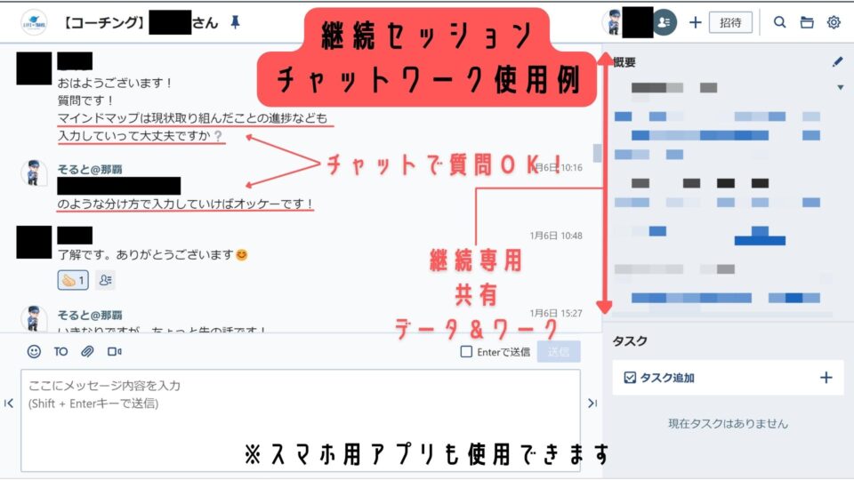 これにより、チャットワーク内で常にコーチと繋がった状態になるため、充実したサポートを行うことができます。
