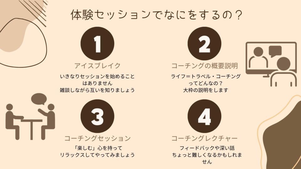 ライフ=トラベル・コーチングは、那覇市内ホテルラウンジ(またはオンライン)で1対1のライフコーチング体験セッションをおこなっています。